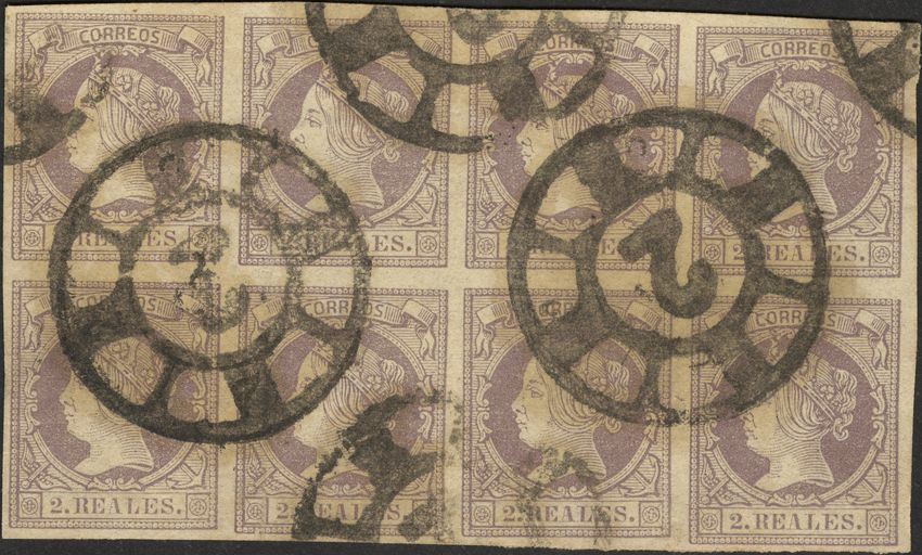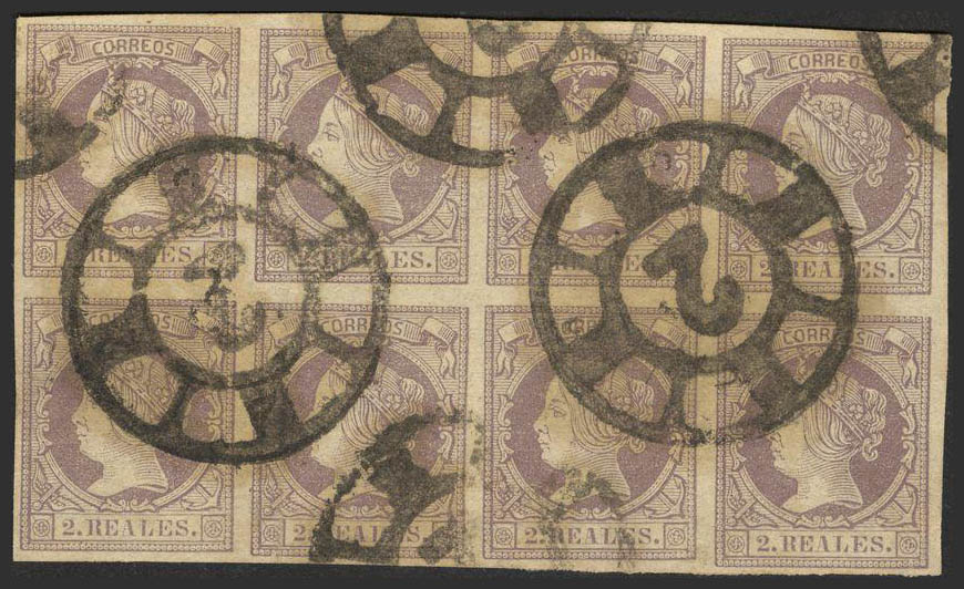 56(8). 1960. 2 reales lila, bloque de ocho. Matasello R. CARRETA Nº2. MAGNIFICO. Edifil 2009: +108 Euros