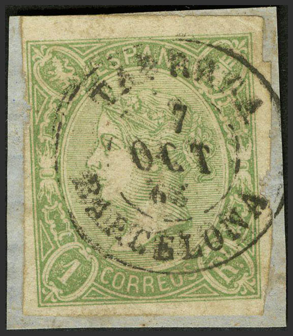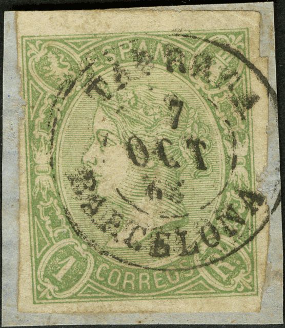 △ 72. 1865. 1 real verde, sobre fragmento. Matasello TARRASA / BARCELONA. MAGNIFICO.