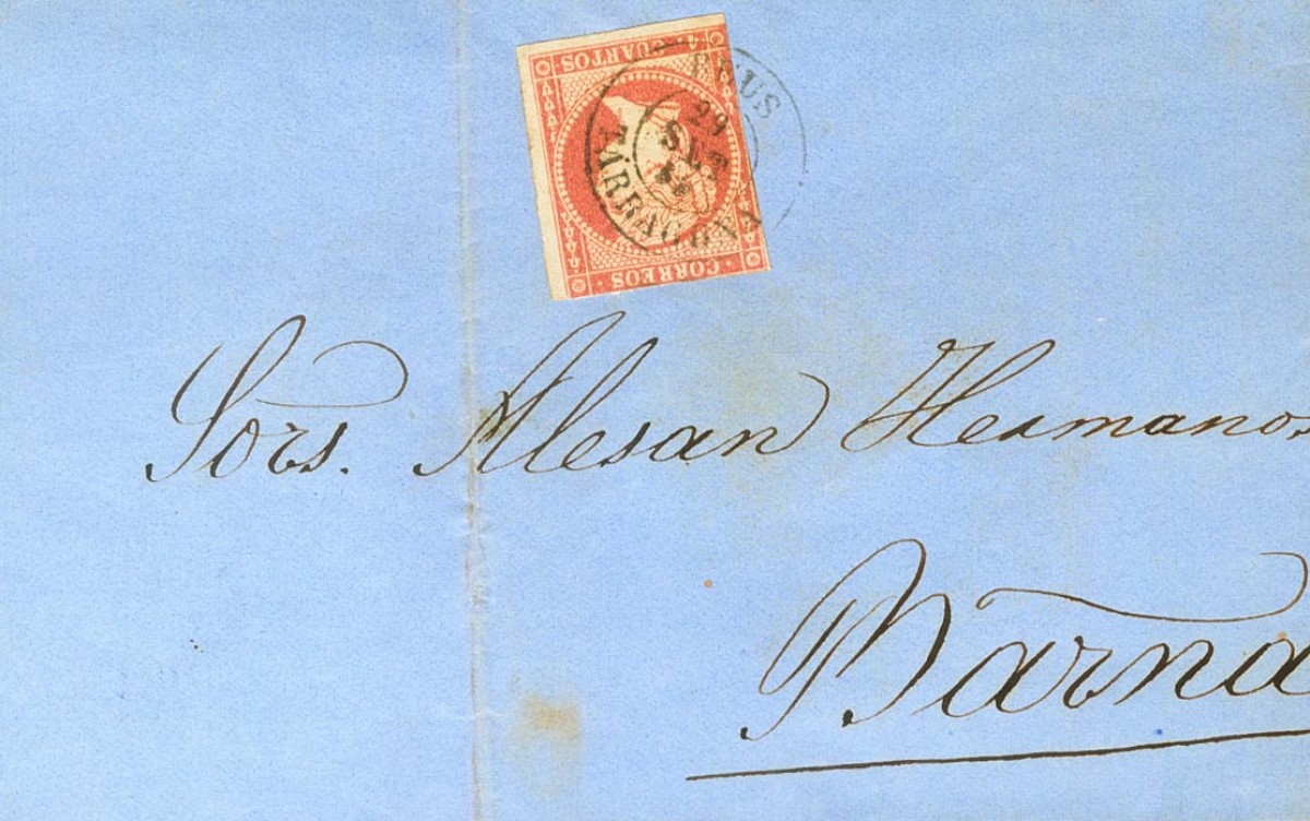 48. 1856. 4 cuartos rojo. REUS a BARCELONA. Matasello REUS / TARRAGONA. MAGNIFICO.