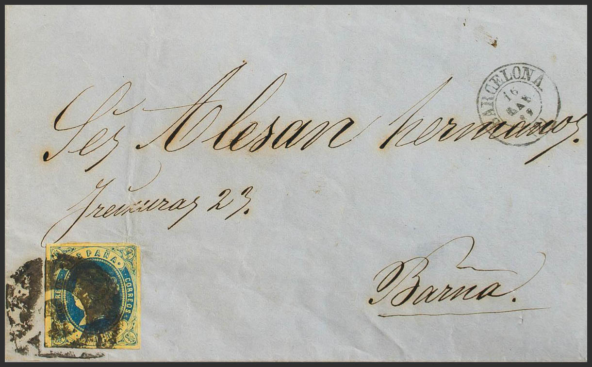 57. 1862. 2 cuartos azul. Correo Interior de BARCELONA. MAGNIFICA.