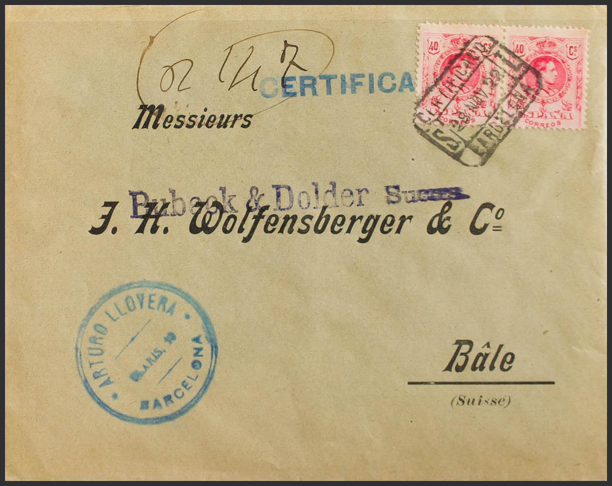 276(2). 1922. 40 cts rosa, pareja. Certificado de BARCELONA a BASILEA (SUIZA). Al dorso llegada. MAGNIFICA.