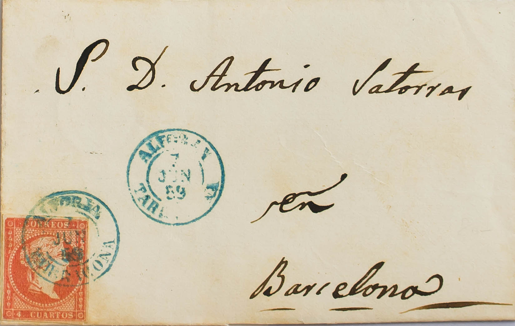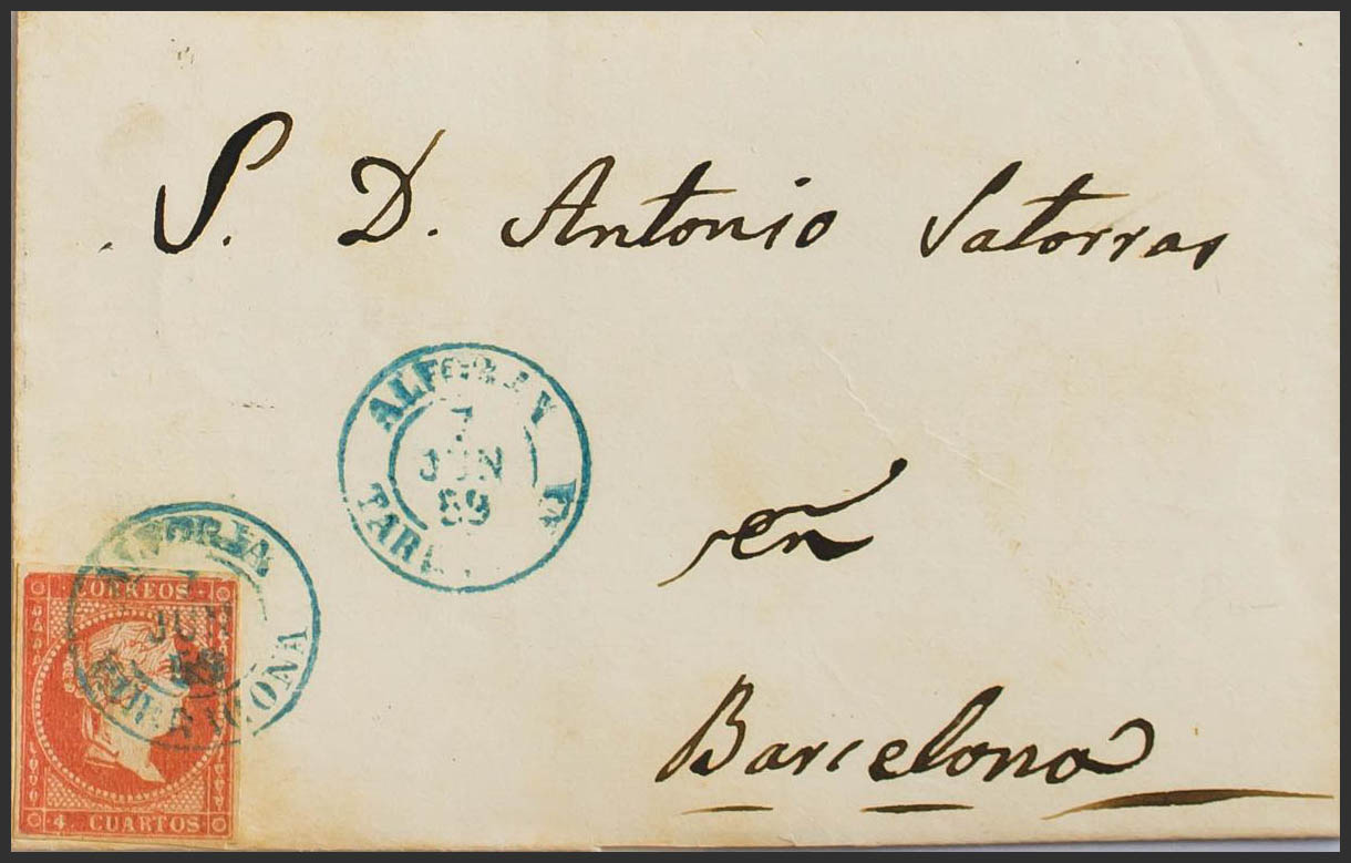 48. 1859. 4 cuartos rojo. ALFORJA a BARCELONA. Matasello ALFORJA / TARRAGONA (Tipo I), en azul. MAGNIFICO Y RARISIMO.