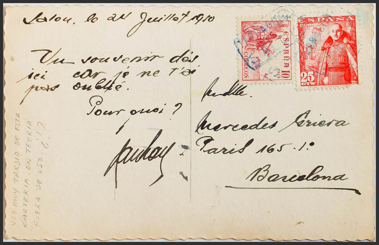1024, 917. 1950. 25 cts rojo y 10 cts rosa. Tarjeta Postal de SALOU a BARCELONA. Matasello cartería TARRAGONA / SALOU, en azul. MAGNIFICA Y RARISIMA, ESPECIALMENTE UN USO TAN TARDIO.