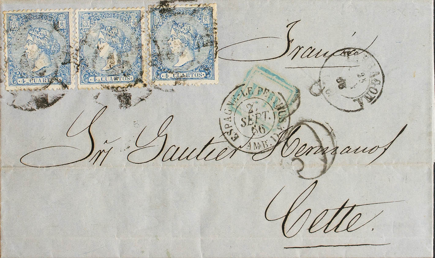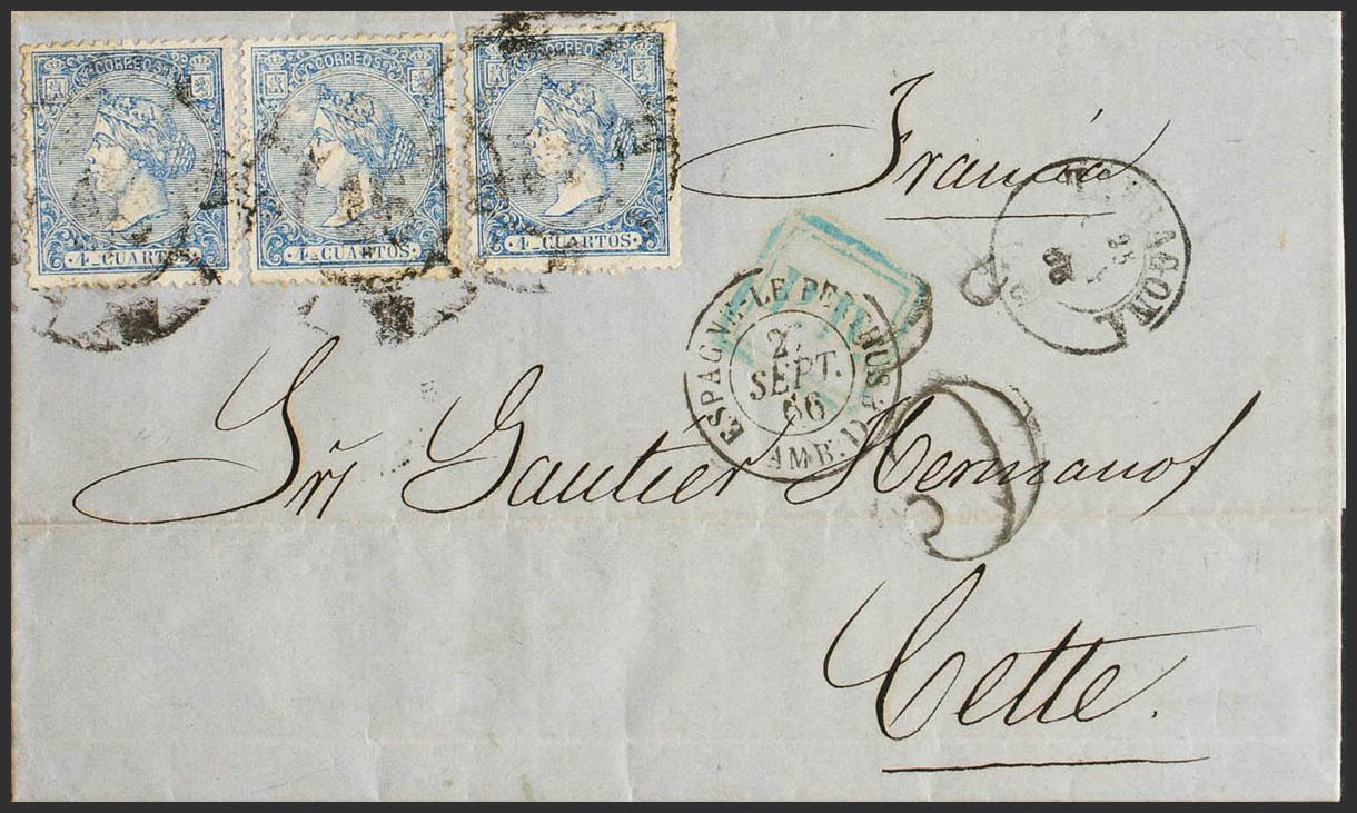 81(3). 1866. 4 cuartos azul, tres sellos. TARRAGONA a CETTE (FRANCIA). MAGNIFICA E INUSUAL COMPOSICION DE LA TARIFA DE 12 CUARTOS A FRANCIA.
