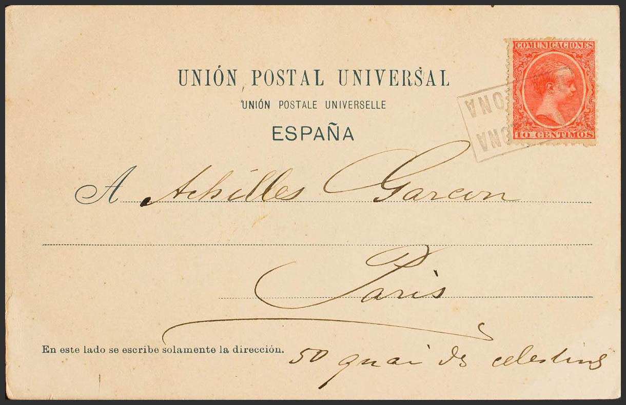218. 1900. 10 cts bermellón. Tarjeta Postal de BARCELONA a PARIS. Matasello carterÃa rectangular BARCELONA / BADALONA. MAGNIFICA.