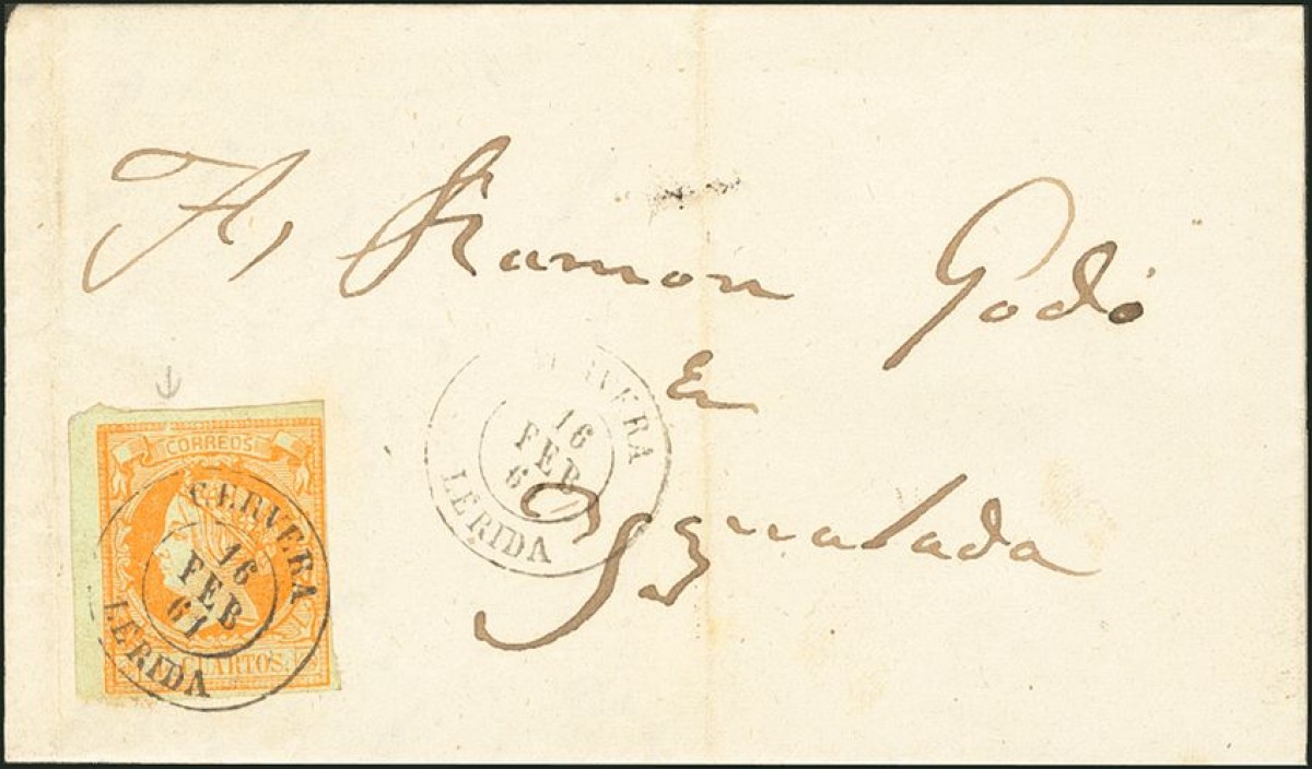 52. 1860. 4 cuartos amarillo. CERVERA a IGUALADA. Matasello CERVERA / LERIDA. MAGNIFICA.