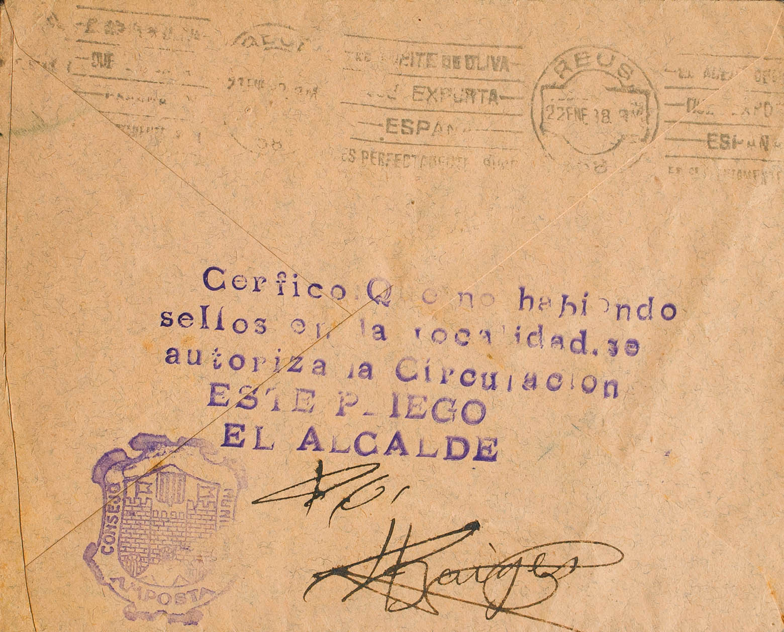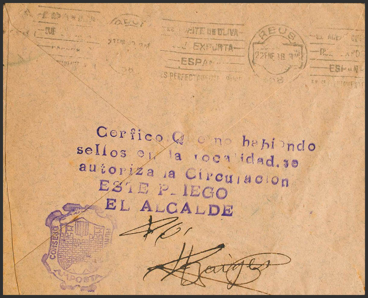 1938. AMPOSTA a REUS. Al dorso marca "Certifico: Que no habiendo sellos en la localidad, se autoriza la circulación de este pliego. El Alcalde." y marca del ayuntamiento, ambas en violeta. MAGNIFICA Y RARA.