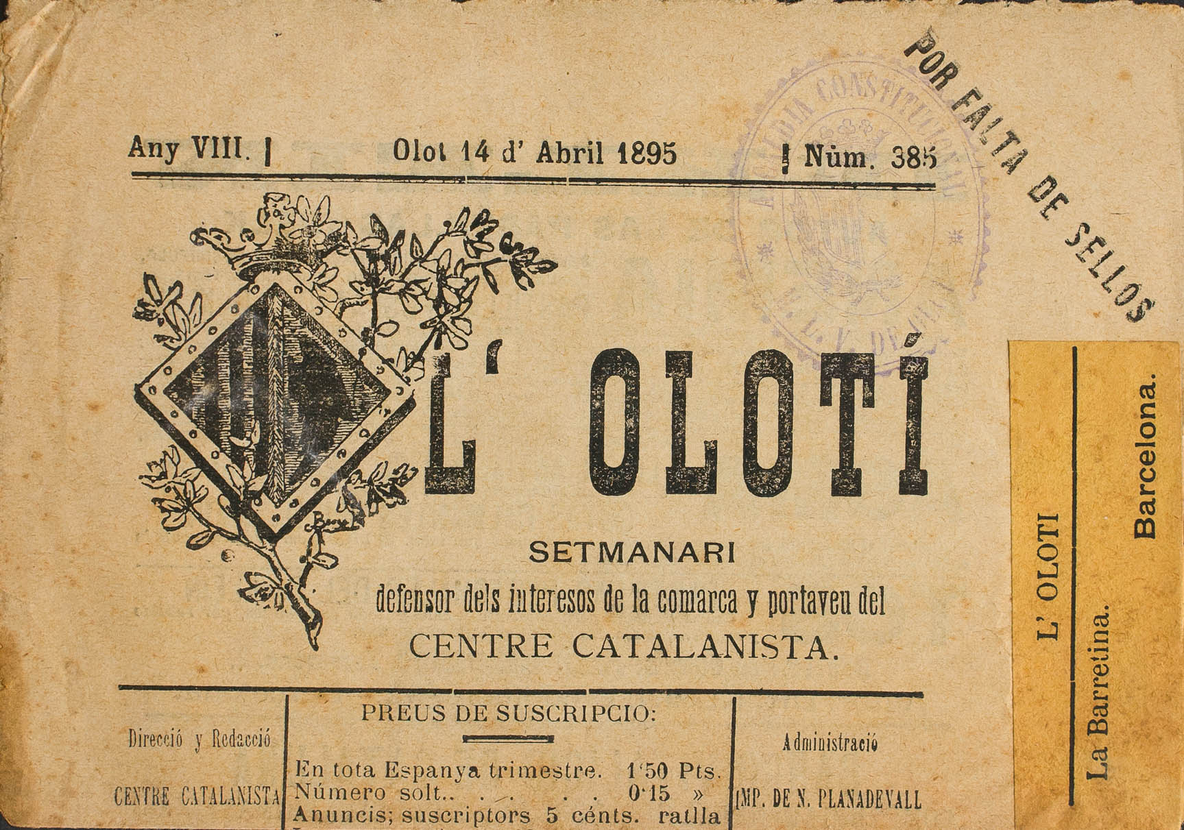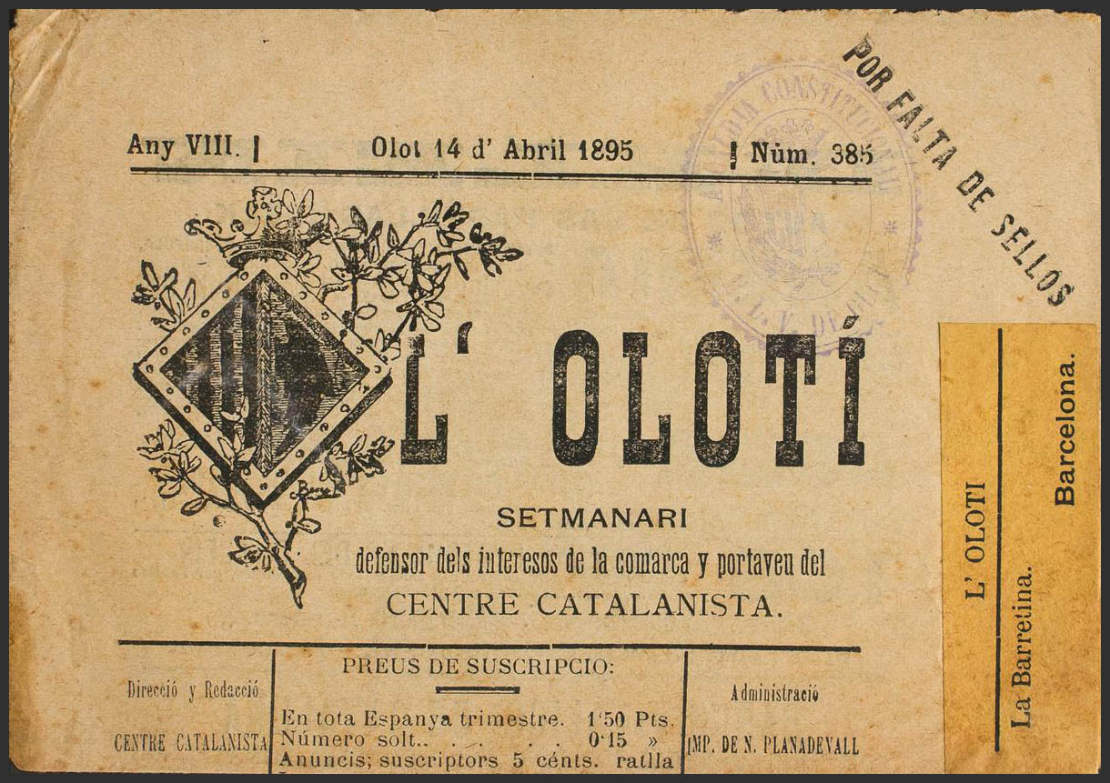 1895. "Semanario del Centro Catalanista de Olot" de OLOT a BARCELONA. Marcas POR FALTA DE SELLOS y ALCALDIA CONSTITUCIONAL / *M.L.V. DE OLOT*. MAGNIFICO Y MUY RARO.