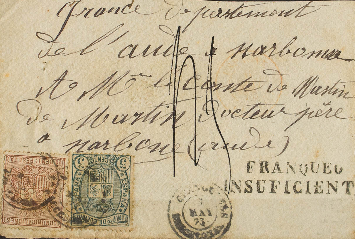 153, 154. 1875. 10 cts castaño y 5 cts verde (Impuesto de Guerra). Frontal de GRANOLLERS a NARBONA (FRANCIA). Franqueado con tarifa para correo dentro de territorio español y con el Impuesto de Guerra, el correo Francés no reconoce el franqueo y aplica la marca correspondiente de FRANQUEO / INSUFICIENTE y porteo manuscrito. MAGNIFICO Y RARO.