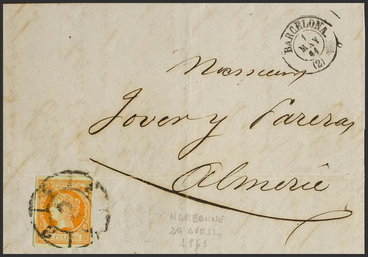 52. 1861. 4 cuartos naranja. NARBONA (FRANCIA) a ALMERIA, encaminada privadamente hasta Barcelona. Se deposita en el correo añadiendo el correspondiente sello para que continue con su ruta. MAGNIFICA Y MUY RARA.
