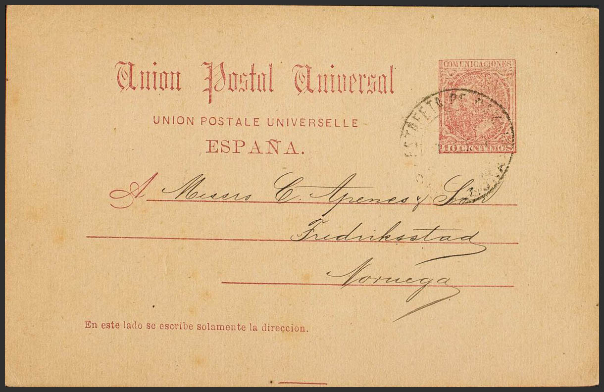 EP15. 1889. 10 cts carmÃn (impresión diluida) sobre Tarjeta Entero Postal de BARCELONA a FRIEDRICHSTAD (NORUEGA). MAGNIFICA E INUSUAL DESTINO.