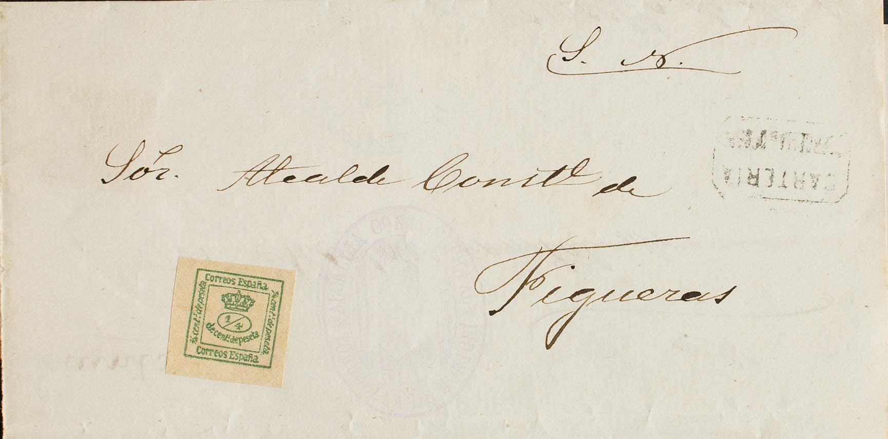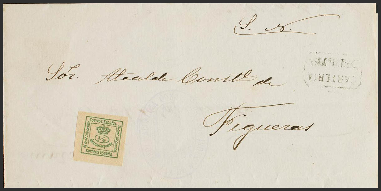 173. (1881ca). ¼ cts verde. TORROELLA DE MONTGRI a FIGUERAS (reutilizada en sentido inverso). En el frente matasello CARTERIA / TORROELLA DE MONTGRI y marca ALCALDIA CONSTITUCIONAL / TORROELLA DE MONTGRI, en violeta. MAGNIFICA Y RARA.
