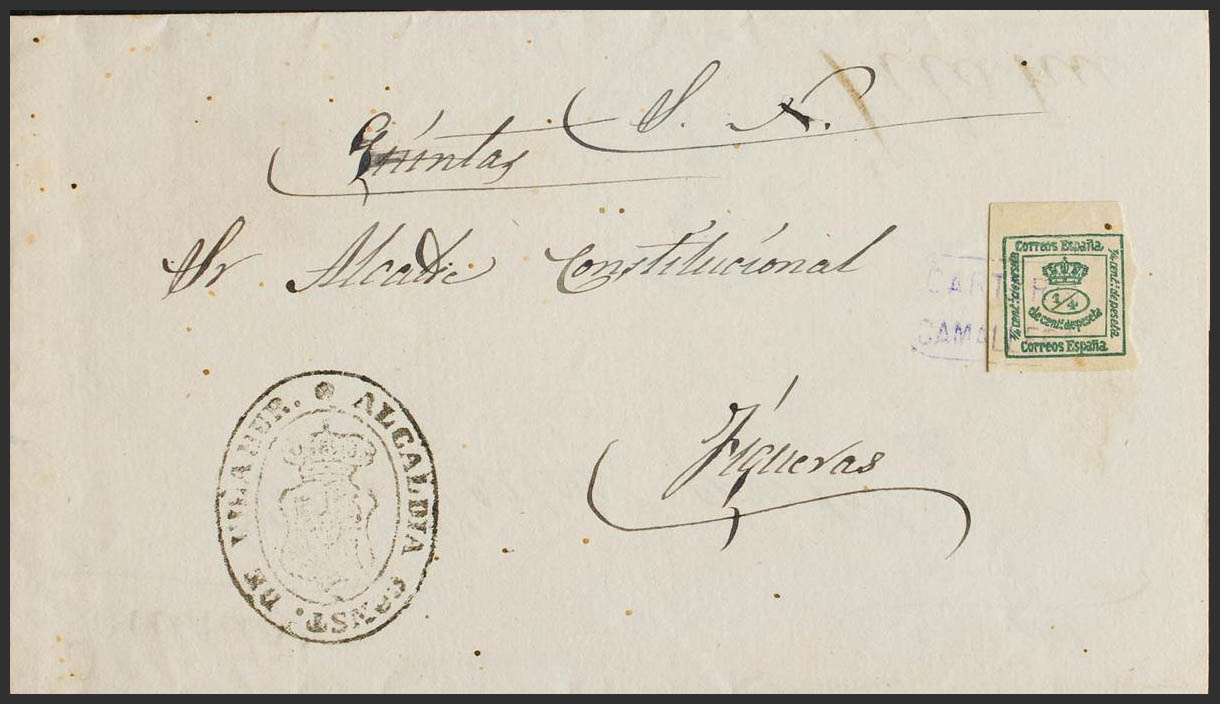 173. (1881ca). ¼ cts verde. CAMALLERA a FIGUERAS (reutilizada en sentido inverso). Matasello CARTERIA / CAMALLERA, en violeta y en el frente marca ALCALDIA CONST. DE VILAHUR, manuscrito "Quintas" (haciendo referencia a las Quintas Militares). MAGNIFICA Y RARA.