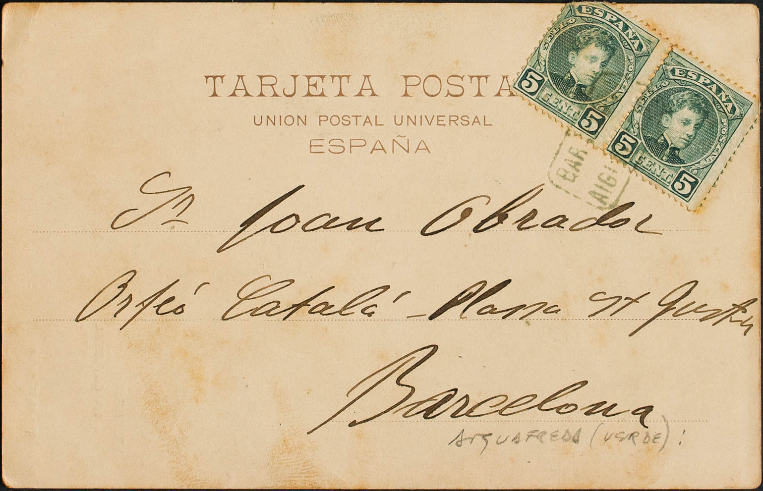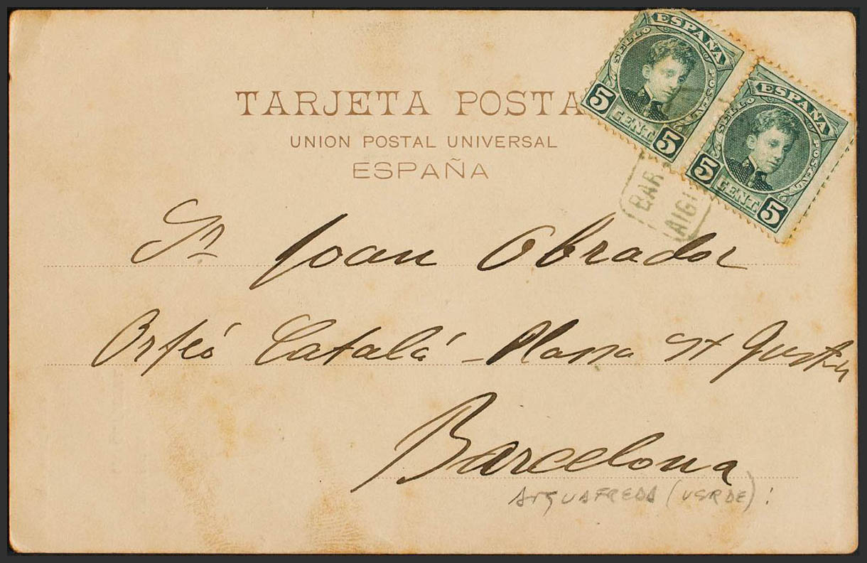 Cataluña. Historia Postal. Cartería BARCELONA / AIGUAFREDA, en azul. MAGNIFICA.