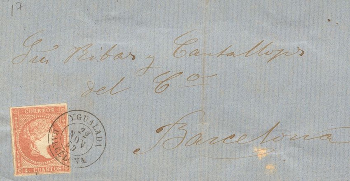 48. 1856. 4 cuartos rojo. Frontal de YGUALADA a BARCELONA. Matasello YGUALADA / BARCELONA. MAGNIFICA.