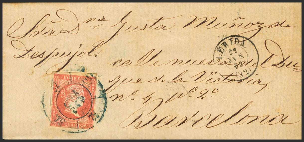 48. 1859. 4 cuartos rojo. LERIDA a BARCELONA. Matasello R.CARRETA Nº32, en azul. MAGNIFICA Y RARA.