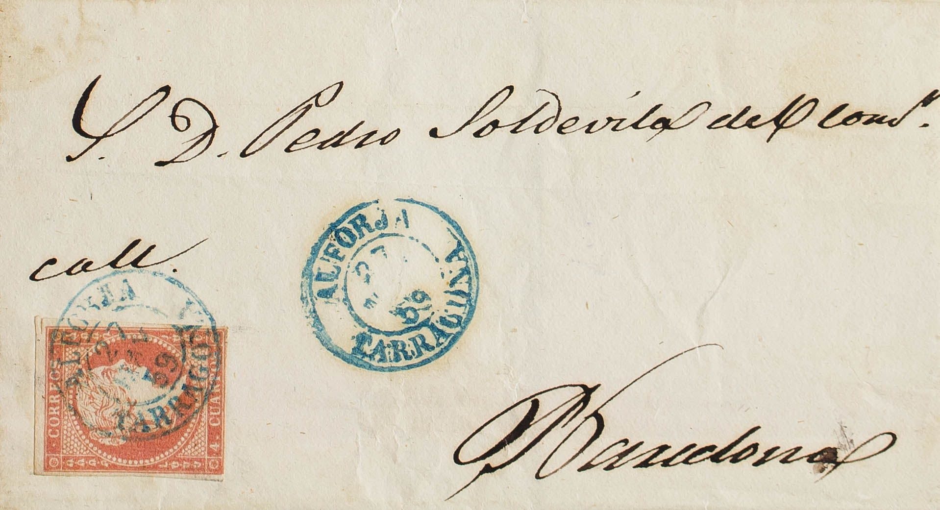 48. 1859. 4 cuartos rojo. ALFORJA a BARCELONA. Matasello ALFORJA / TARRAGONA (Tipo I), en azul. MAGNIFICA Y RARISIMA.