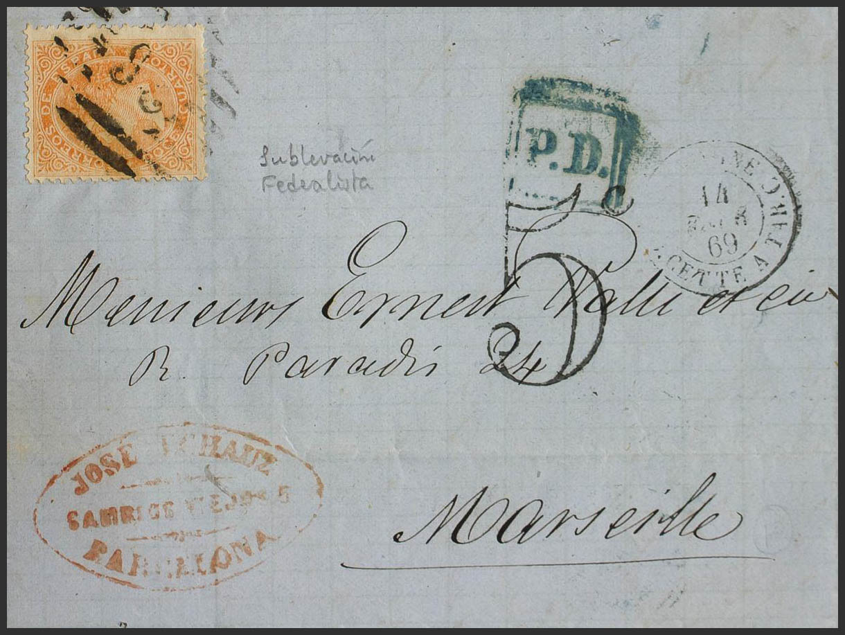 89A. 1869. 12 cuartos naranja. BARCELONA a MARSELLA (FRANCIA). Matasello PARRILLA CON Nº26, debido a la sublevación federalista el correo salÃa por Gerona. MAGNIFICA.