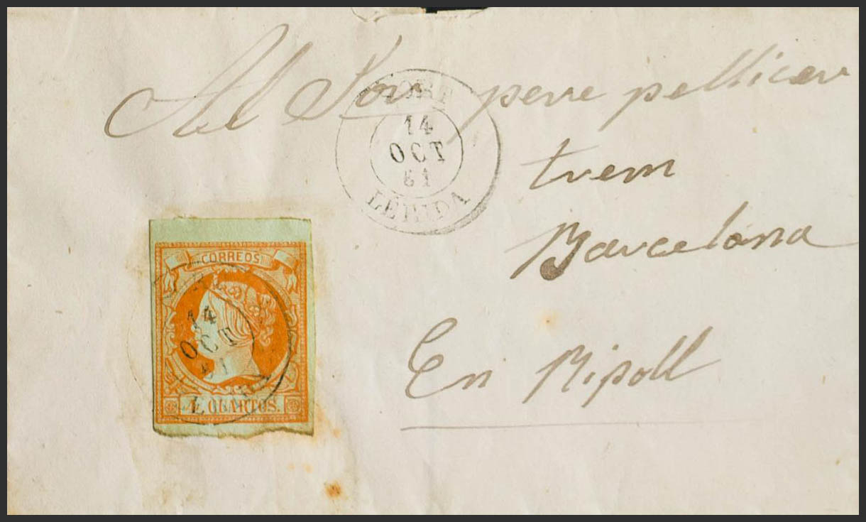 52. 1861. 4 cuartos amarillo. TREMP a RIPOLL. Matasello TREMP / LERIDA. BONITA.
