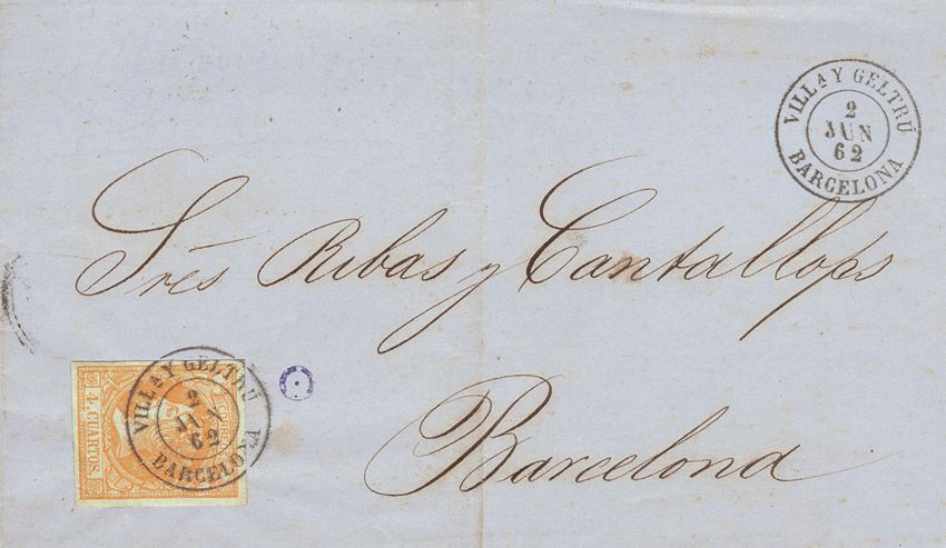 52. 1860. 4 cuartos amarillo. VILLª Y GELTRU a BARCELONA. Matasello VILLª Y GELTRU / BARCELONA. MAGNIFICA.