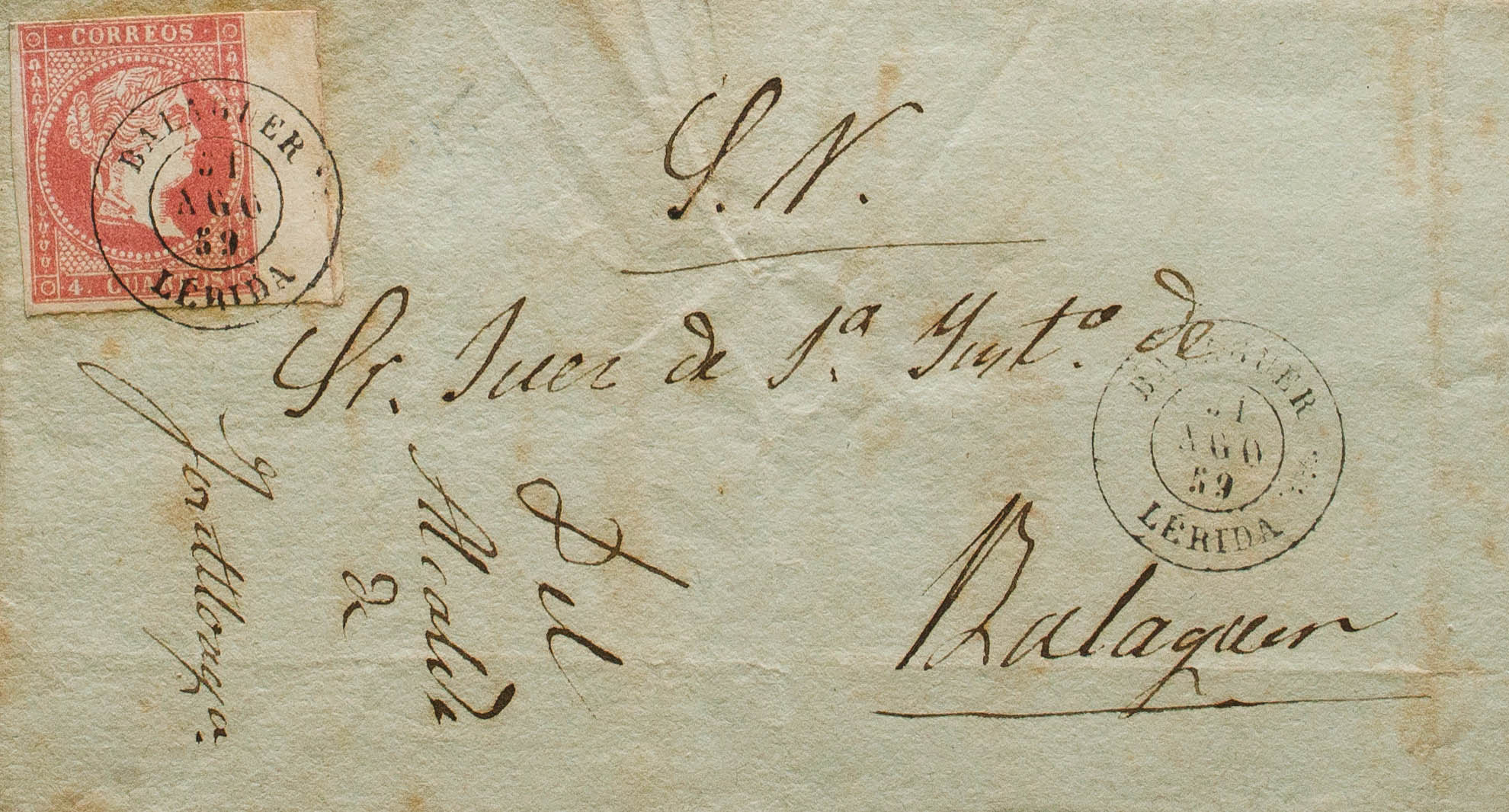 48. 1859. 4 cuartos rojo, borde de hoja. FONTLLONGA a BALAGUER. Matasello BALAGUER / LERIDA, a la llegada. MAGNIFICA Y MUY RARA.