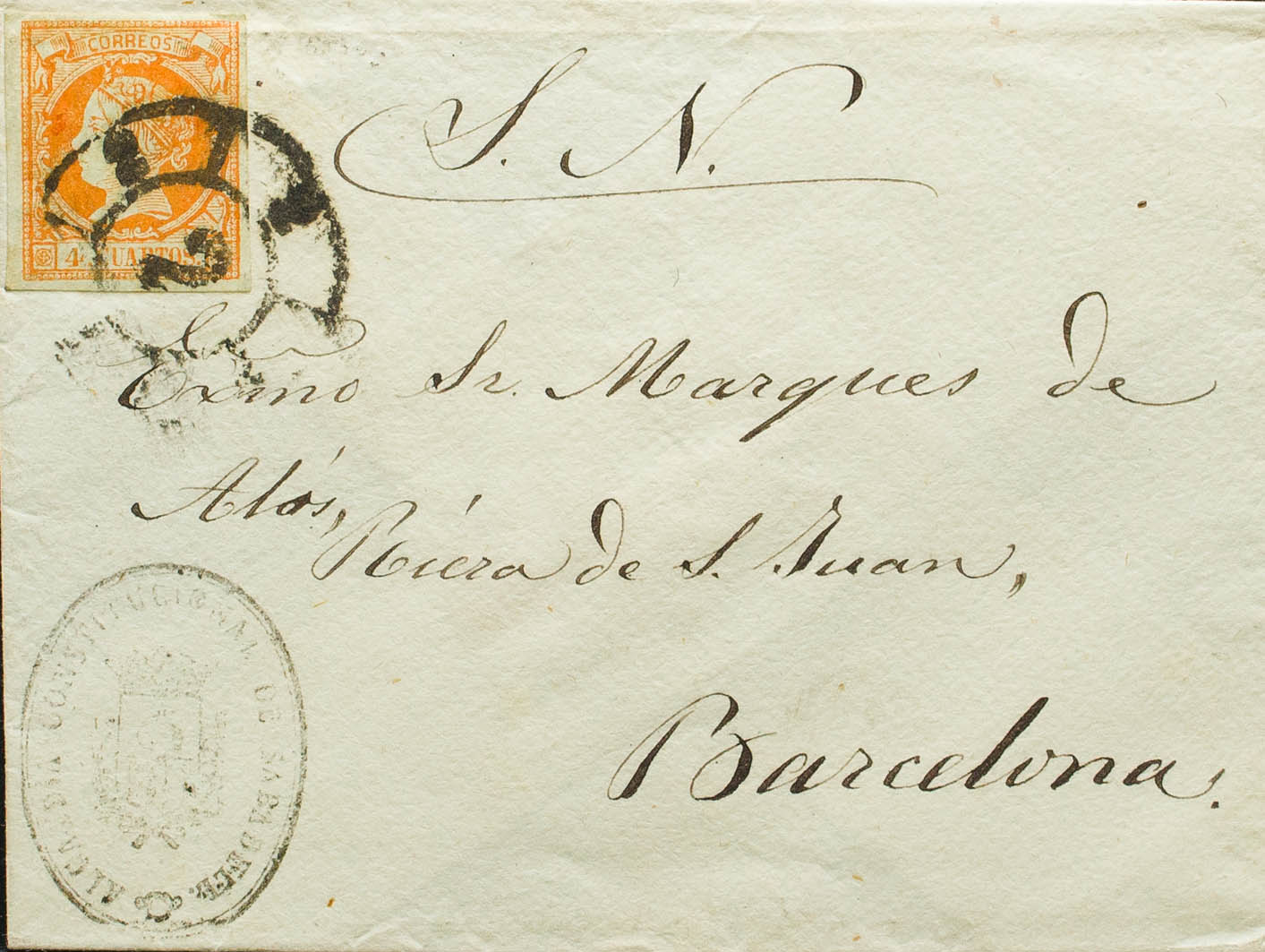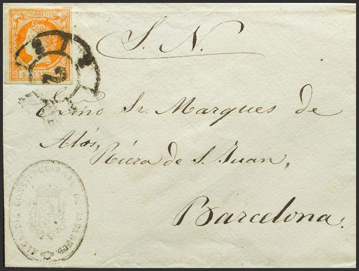 52. 1860. 4 cuartos naranja. SABADELL a BARCELONA. Matasello R.CARRETA Nº2, a la llegada, en el frente marca ALCALDIA CONSTI / DE SABADELL. MAGNIFICA.