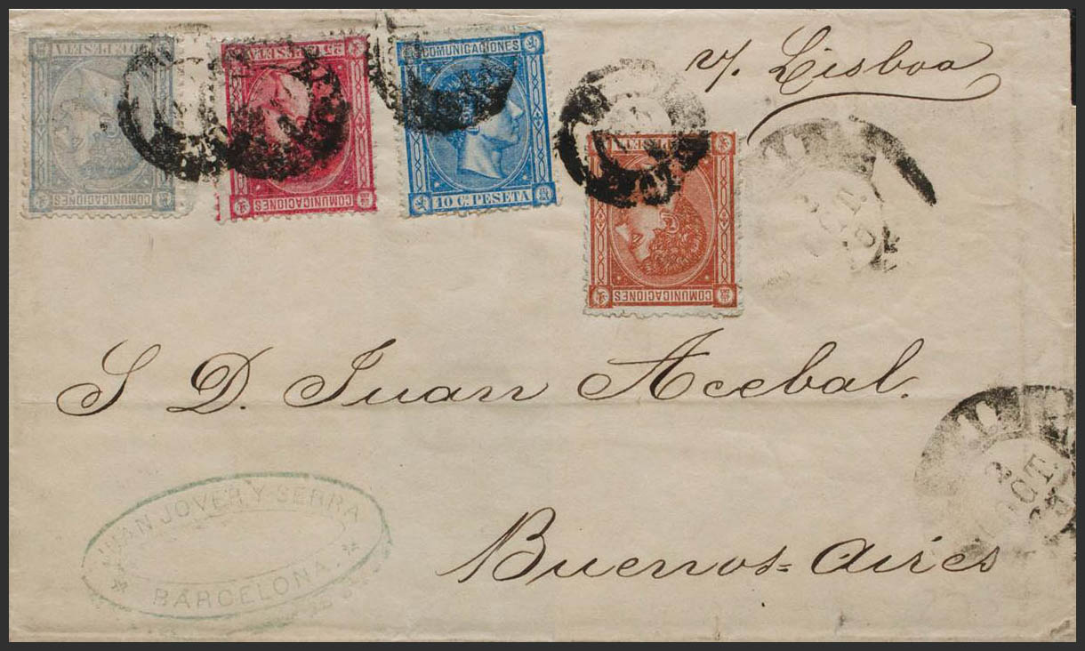 162, 164, 166, 168. 1875. 10 cts azul, 25 cts rosa, 50 cts lila y 2 cts marrón. BARCELONA a BUENOS AIRES (ARGENTINA). MAGNIFICA Y RARISIMA COMBINACION PARA COMPONER LA TARIFA DE 87 CTS A BUENOS AIRES, ESPECTACULAR FRANQUEO DE CUATRO COLORES.