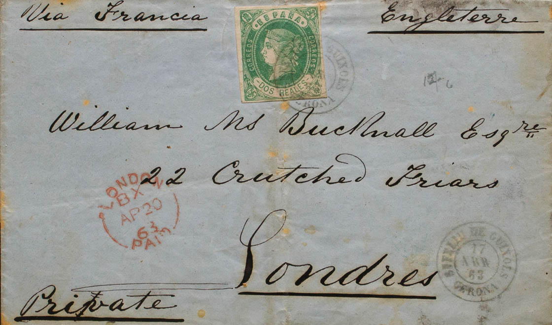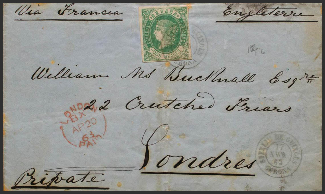 62. 1863. 2 reales verde (doblez de archivo). SAN FELIU DE GUIXOLS a LONDRES (INGLATERRA). Matasello S. FELIU DE GUIXOLS / GERONA. MAGNIFICA.