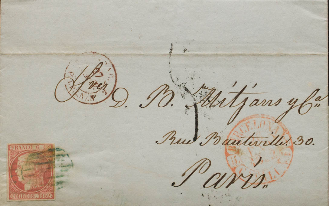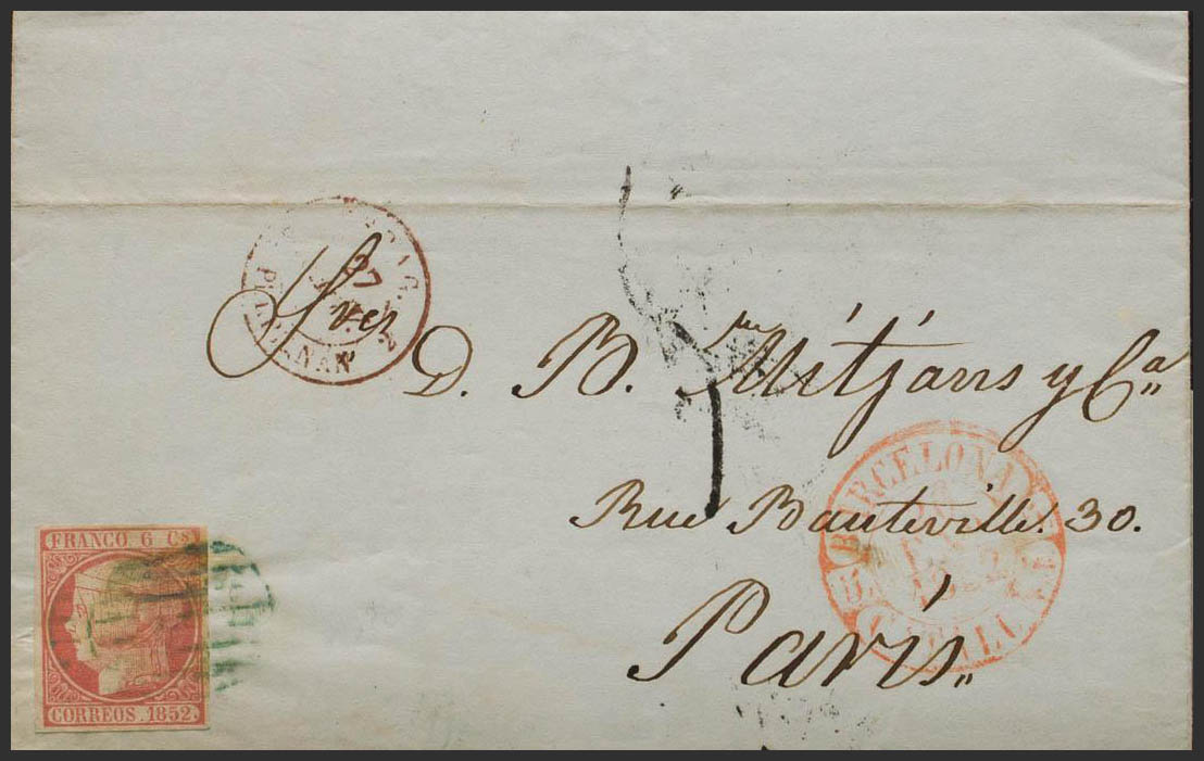 12. 1852. 6 cuartos rosa. BARCELONA a PARIS (FRANCIA). Matasello PARRILLA, en azul y en el frente porteo francés "5", según Convenio Postal con Francia, en vigor desde Enero de 1850, no era necesario el franqueo de la correspondencia ordinaria. MAGNIFICA Y RARISIMA, MUY POCAS CARTAS CONOCIDAS DIRIGIDAS A FRANCIA CON EL 6 CUARTOS DE 1852 Y CON LA PARTICULARIDAD DE SER ANULADA CON LA PARRILLA AZUL.