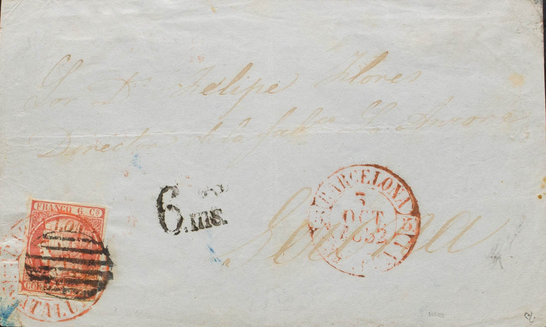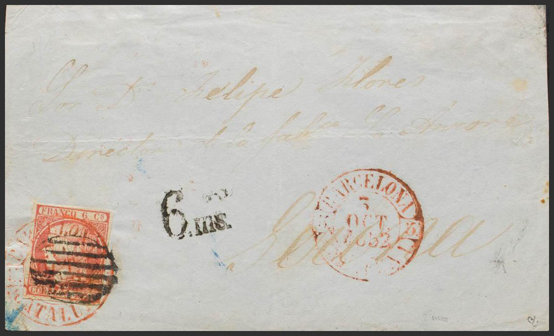 12. 1852. 6 cuartos rosa. Frontal de BARCELONA a GERONA. Matasello mixto PARRILLA y baeza BARCELONA / CATALUÑA. MAGNIFICO Y RARISIMO, PIEZA DE ENORME ESPECTACULARIDAD. Ex-Tizón.