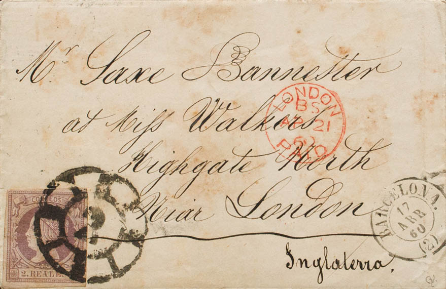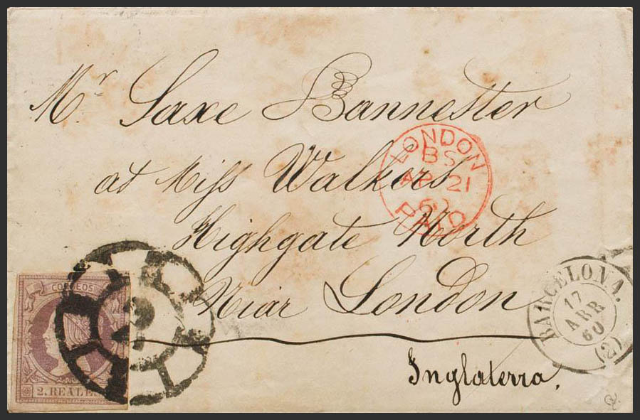56. 1860. 2 reales lila. BARCELONA a LONDRES (GRAN BRETAÑA). MAGNIFICA. Ex-Tizón.