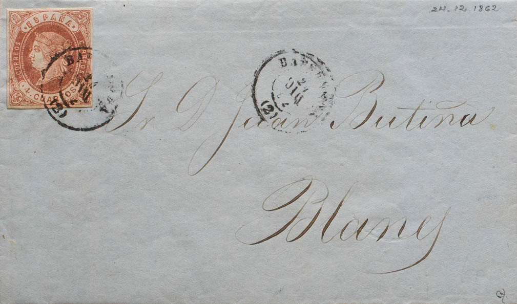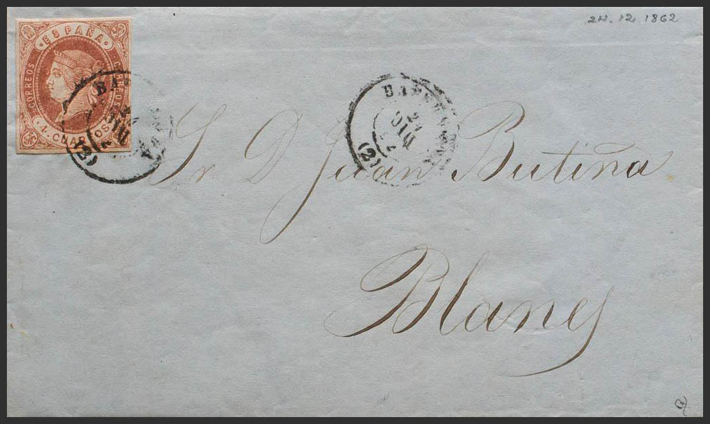 58. 1862. 4 cuartos castaño. BARCELONA a BLANES. Matasello BARCELONA / (2). MAGNIFICA Y RARISIMA. Ex-Tizón.