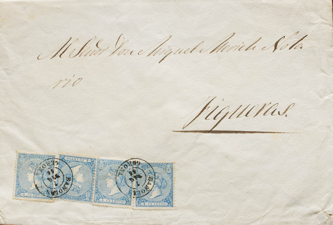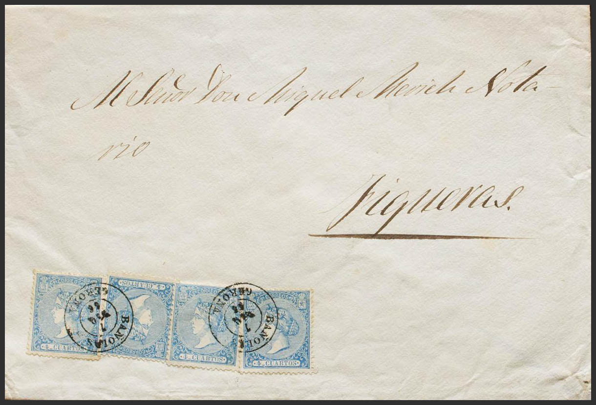 81(4). 1866. 4 cuartos azul, cuatro sellos. BAÑOLAS a FIGUERAS. Matasello BAÑOLAS / GERONA. MAGNIFICA E INUSUAL FRANQUEO DE CUATRO PORTES. Ex-Tizón.