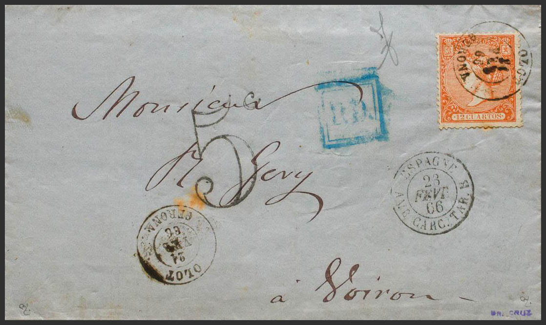 82. 1866. 12 cuartos naranja. OLOT a VOIRON (FRANCIA). Matasello OLOT / GERONA. MAGNIFICA Y RARA. Ex-Tizón.