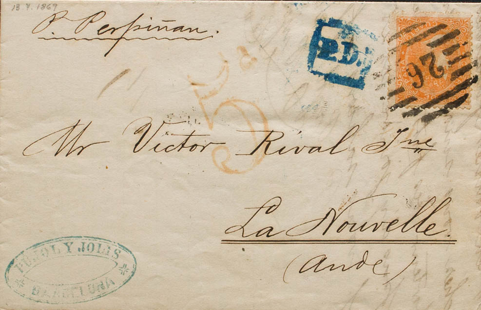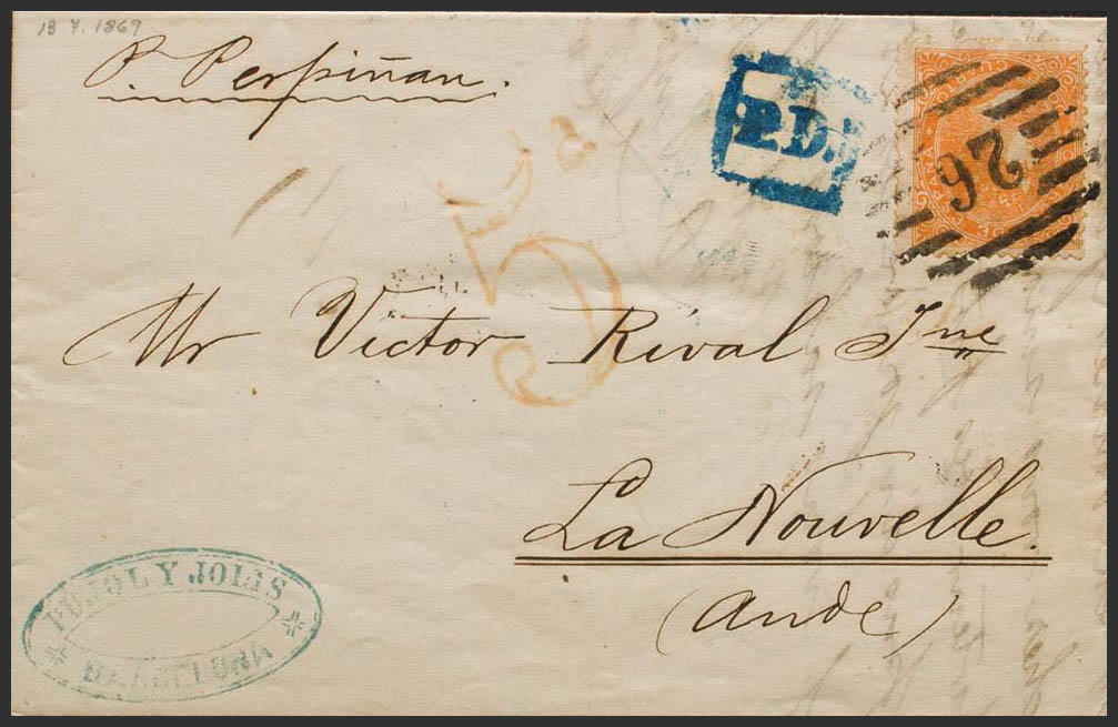 89A. 1869. 12 cuartos naranja. BARCELONA a LA NOUVELLE (FRANCIA). Matasello PARRILLA CON Nº26 (debido a la sublevación federalista, el correo de Barcelona salía por Gerona), en el frente manuscrito "Por Perpiñan". MAGNIFICA. Ex-Tizón.