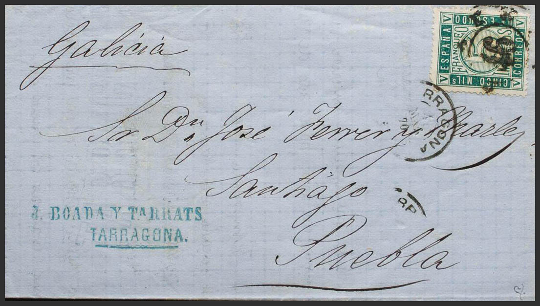 93. 1870. 5 mils verde. TARRAGONA a PUEBLA DEL CARAMIÑAL. Matasello R.CARRETA Nº46 (modificada), franqueo de impresos según tarifa de Septiembre de 1867, estando en vigor la nueva tarifa de Julio de 1869 que establece el franqueo en 1 mils de escudo. MAGNIFICA Y RARA. Ex-Tizón.