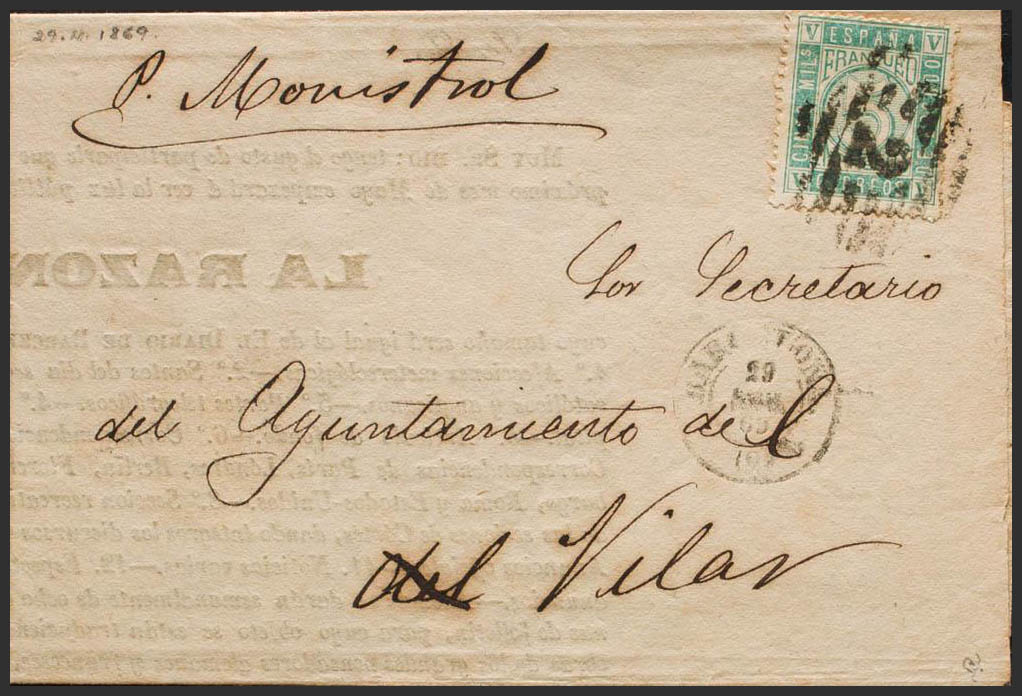 93. 1869. 5 mils verde. BARCELONA a VILAR. Tarifa de impresos. MAGNIFICA. Ex-Tizón.