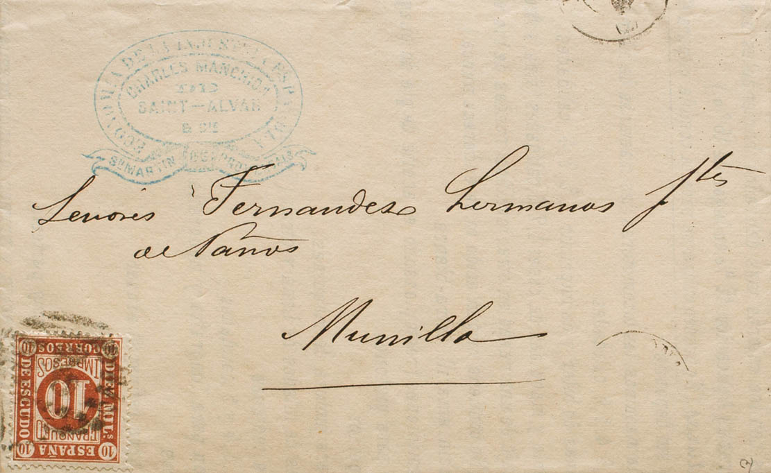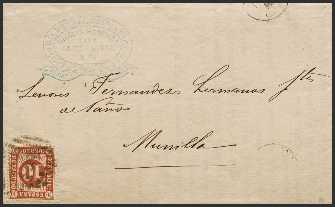 94. 1868. 10 mils castaño. SAN MARTIN DE PROVENZALS (BARCELONA) a MUNILLA (LA RIOJA). Tarifa de impresos en vigor desde Julio de 1867. MAGNIFICA. Ex-Tizón.