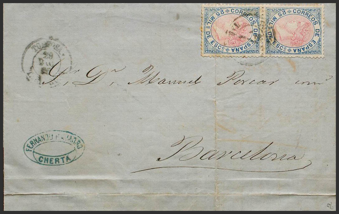 95(2). 1868. 25 mils azul y rosa, pareja (un sello doblez de archivo). CHERTA (TARRAGONA) a BARCELONA. Matasello TORTOSA / TARRAGONA, en tránsito. BONITA Y RARA COMBINACION DE FRANQUEO PARA COMPONER LOS 50 MILS DE PORTE SIMPLE. Ex-Tizón.