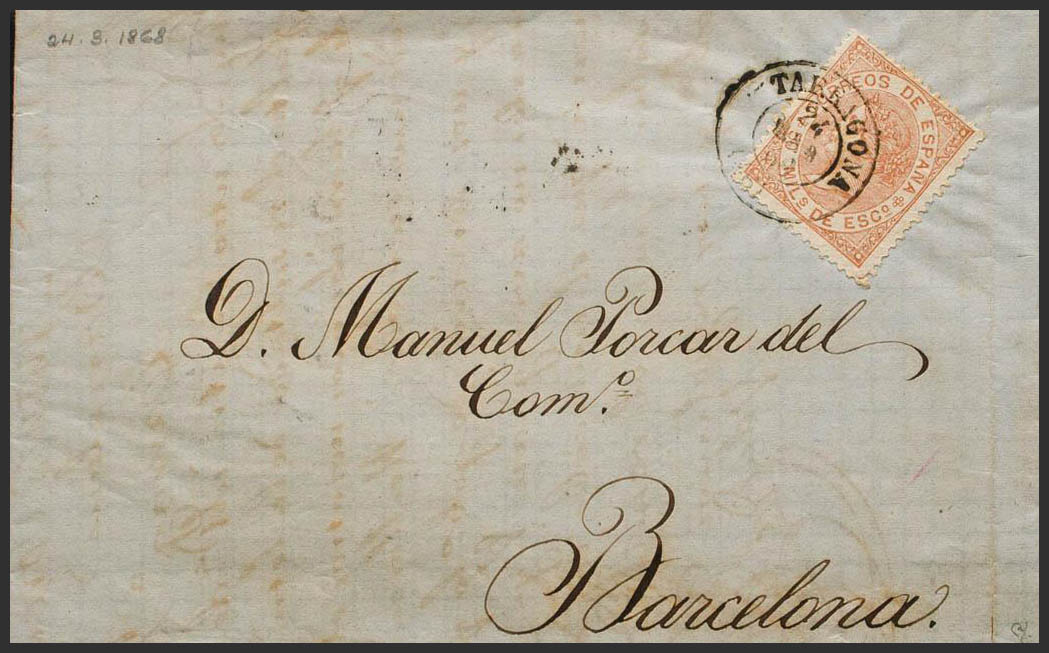 96. 1868. 50 mils castaño amarillo. TARRAGONA a BARCELONA. Matasello TARRAGONA / (46). MAGNIFICA Y RARA. Ex-Tizón.