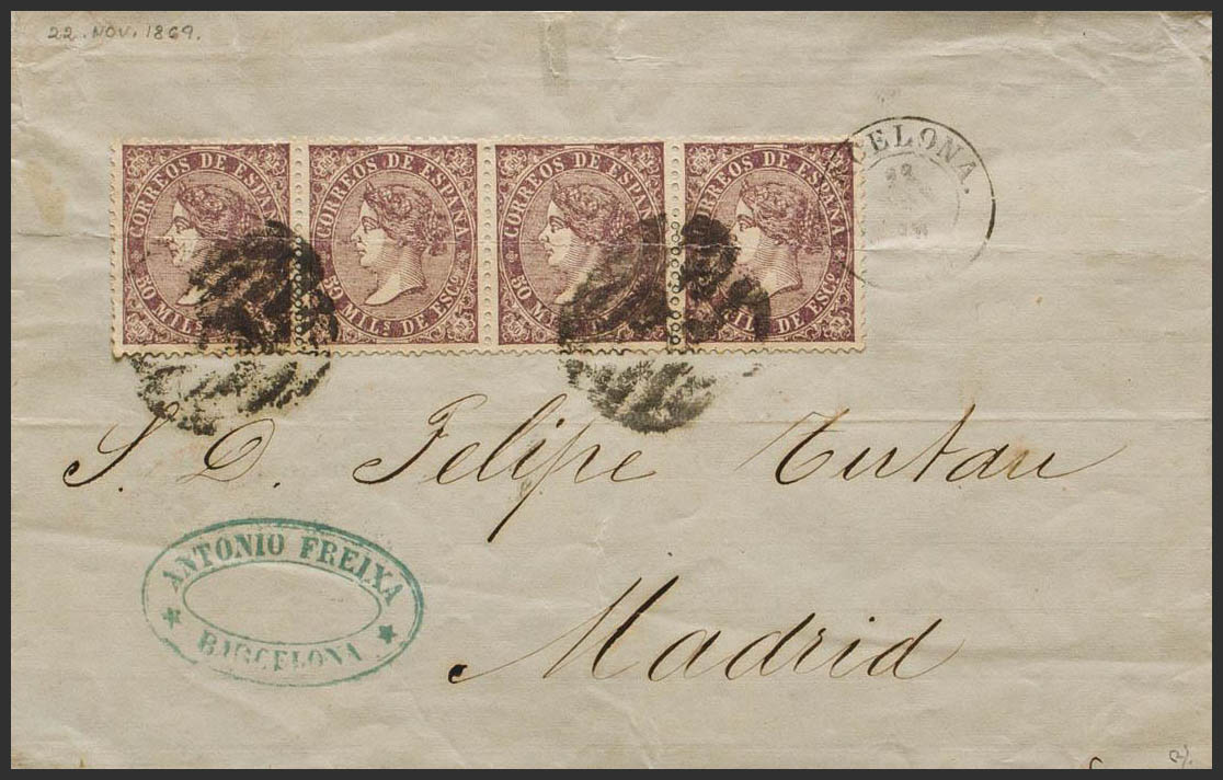 98(4). 1869. 50 mils violeta, tira de cuatro. BARCELONA a MADRID. MAGNIFICA E INUSUAL FRANQUEO DE CUATRO PORTES. Ex-Tizón.