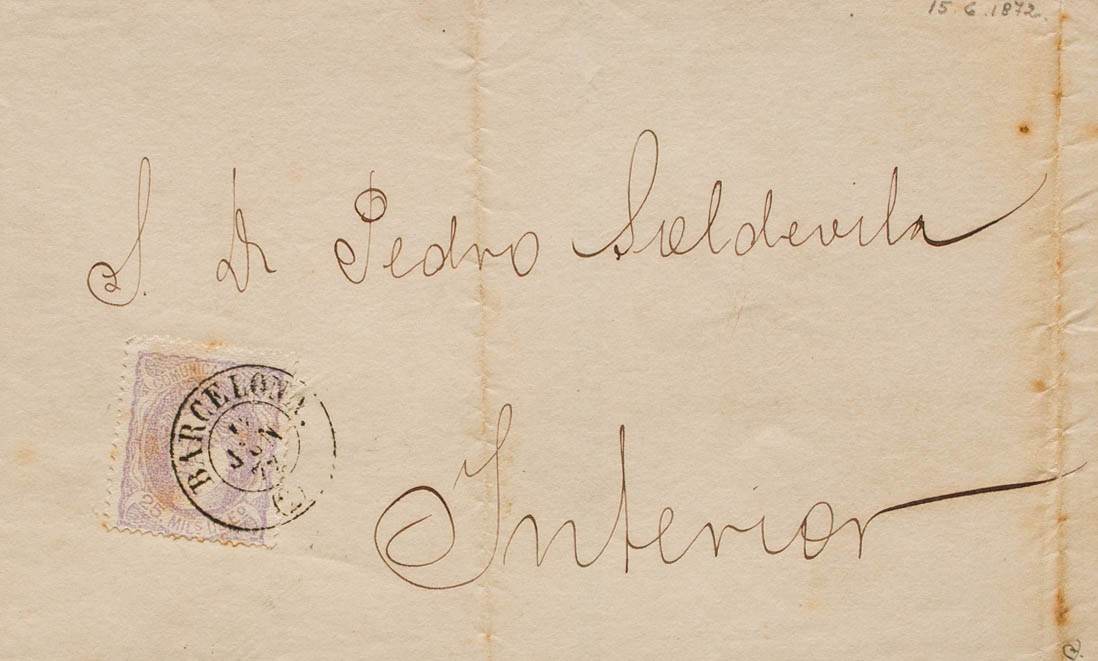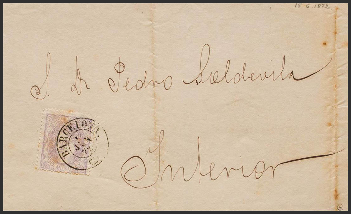 106. 1872. 25 mils lila. Correo Interior de BARCELONA. Matasello fechador (de diámetro 20.5 mm) BARCELONA / (2). MAGNIFICA. Ex-Tizón.