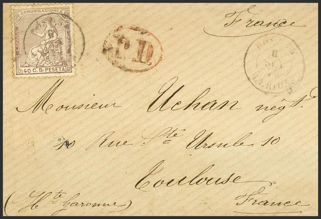 136. 1873. 40 cts castaño violeta. BOSOST (VALLE DE ARAN, LERIDA) a TOULOUSE (a falta de una solapa trasera, sin importancia). Matasello BOSOST / LERIDA. MAGNIFICA Y RARISIMA, POSIBLEMENTE SE TRATE DE LA UNICA CARTA CONOCIDA EN ESTA EMISION CON ESTE EXTREMADO RARO ORIGEN. Ex-Tizón.