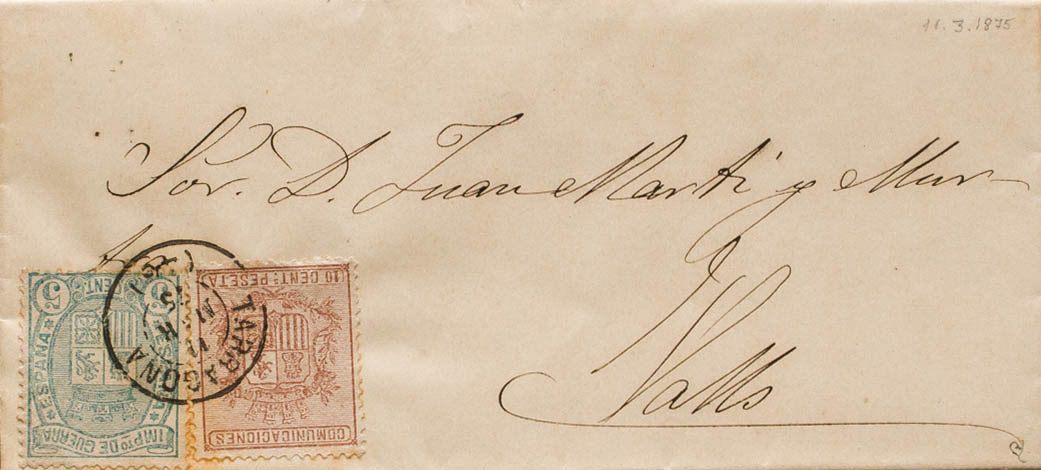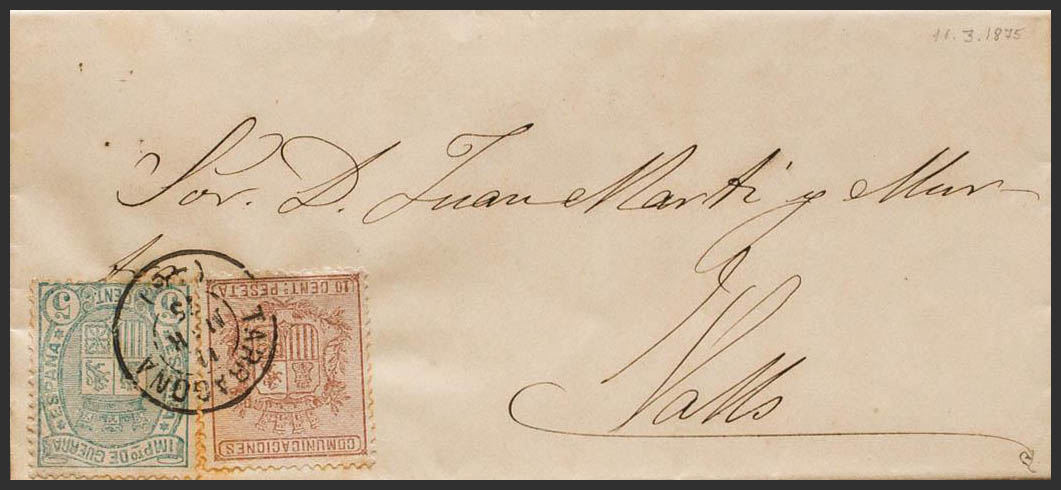153, 154. 1875. 10 cts castaño y 5 cts verde. TARRAGONA a VALLS. Matasello TARRAGONA / (46). MAGNIFICA. Ex-Tizón.