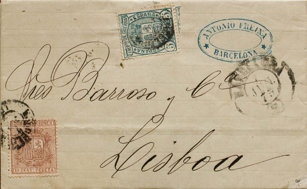 153, 154. 1875. 10 cts castaño y 5 cts verde. BARCELONA a LISBOA (PORTUGAL). Circulada con exceso de franqueo (3 cts) según tarifa de 50 mils ó 12 cts de Agosto de 1867. MAGNIFICA Y MUY RARA. Ex-Tizón.