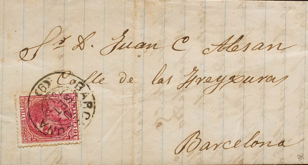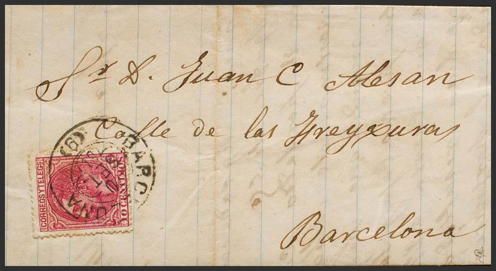 202. 1881. 10 cts rosa carmín. LERIDA a BARCELONA, depositada en el correo de Barcelona para circular como Correo Interior. Matasello trébol (letras grandes) BARCELONA / (9). MAGNIFICA. Ex-Tizón.