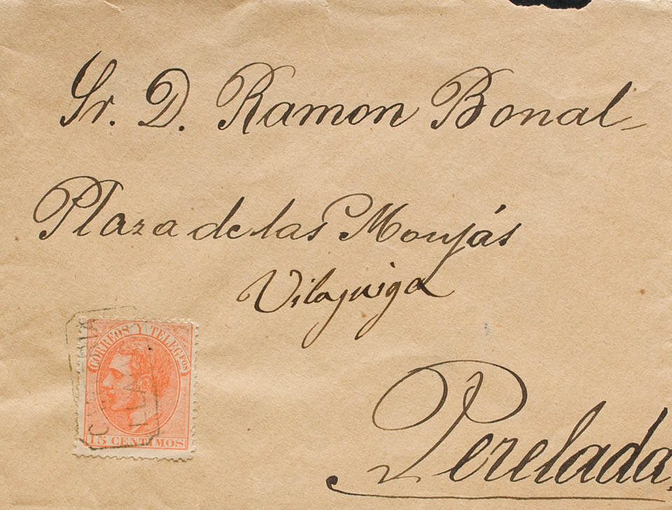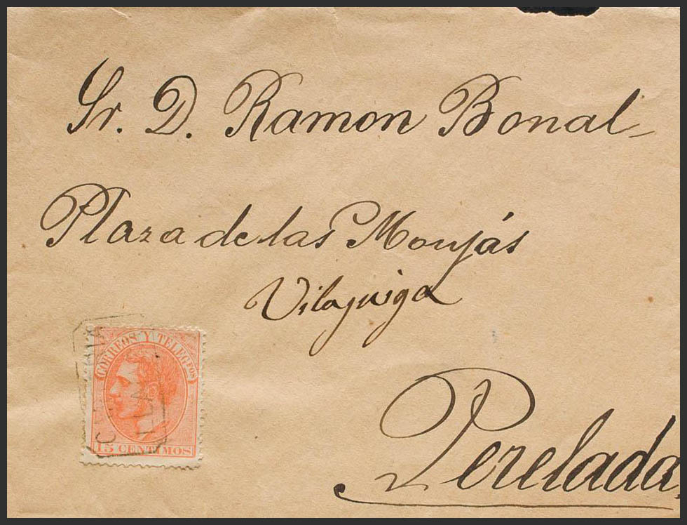 210. (1882ca). 15 cts naranja. LLANSA (GERONA) a PERELADA. Matasello CARTERIA / LLANSA. MAGNIFICA Y RARA. Ex-Tizón.