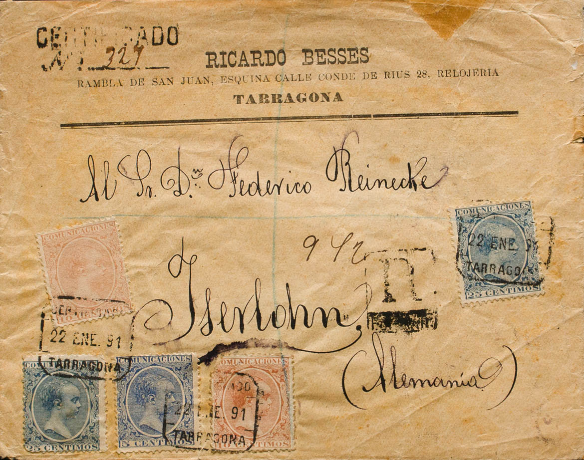 215, 217(2), 221(2). 1891. 5 cts azul, 10 cts castaño amarillo, dos sellos (uno con defecto sin importancia) y 25 cts azul, dos sellos. Certificado de TARRAGONA a ISERLOHN (ALEMANIA). Al dorso llegada. BONITO E INUSUAL COMBINACION DE FRANQUEO. Ex-Tizón.