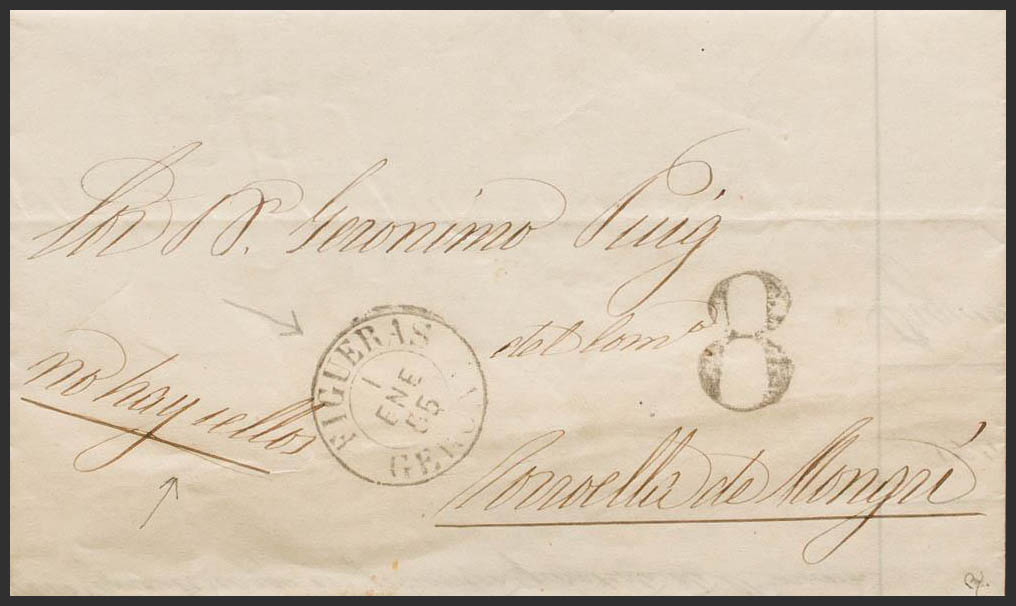 1855. FIGUERAS a TORROELLA DE MONGRI. En el frente fechador FIGUERAS / 1-ENE-1855 / GERONA (Tipo I), porteo "8" y manuscrito "No hay sellos". MAGNIFICA Y MUY RARA. Ex-Tizón.