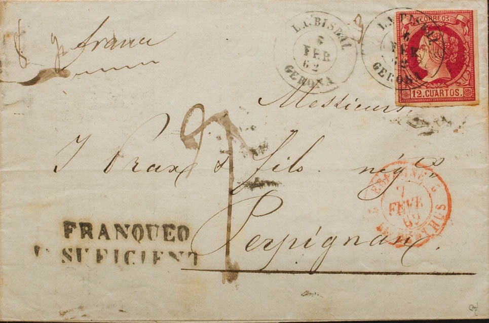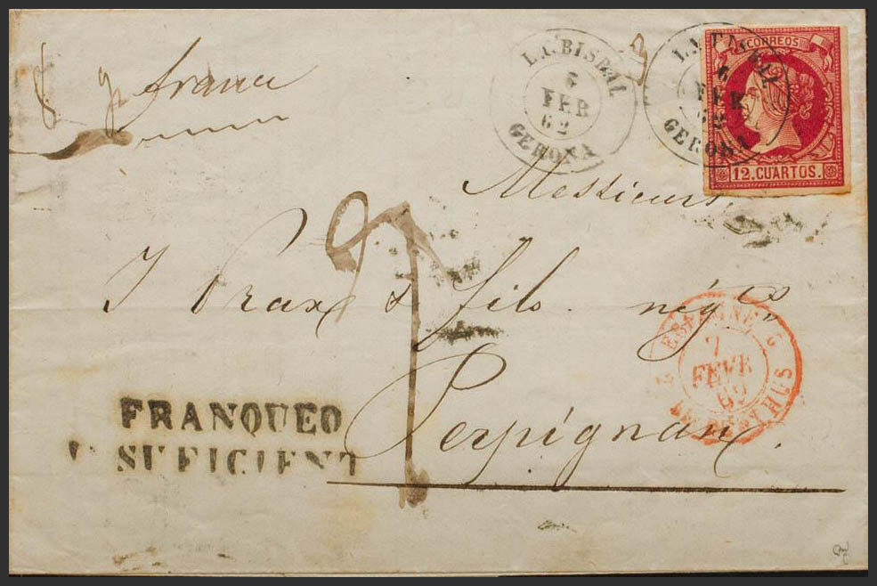 53. 1862. 12 cuartos carmín. PALAFRUGELL a PERPIÑAN (FRANCIA). Matasello LA BISBAL / GERONA y en el frente marca FRANQUEO / INSUFICIENTE y porteo francés "9". MAGNIFICA. Ex-Tizón.